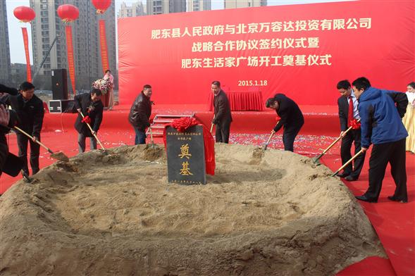 2015年1月18日肥东县人民政府·北京万容达投资有限公司战略合作协议签约暨肥东首个生活·家广场项目奠基仪式隆重举行,现场礼花齐放、彩旗飘扬、锣鼓喧天、热闹非凡。肥东县政府以及北京万容达投资有限公司相关领导出席了庆典仪式。
